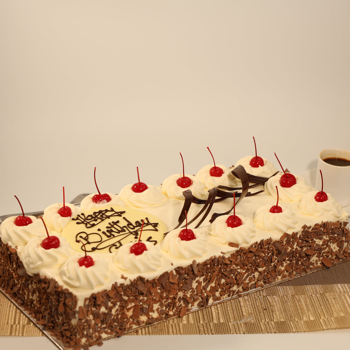 Indulge in our extra-large Black Forest cake, where rich, moist chocolate layers mingle with vibrant, tart cherries and billowy whipped cream.