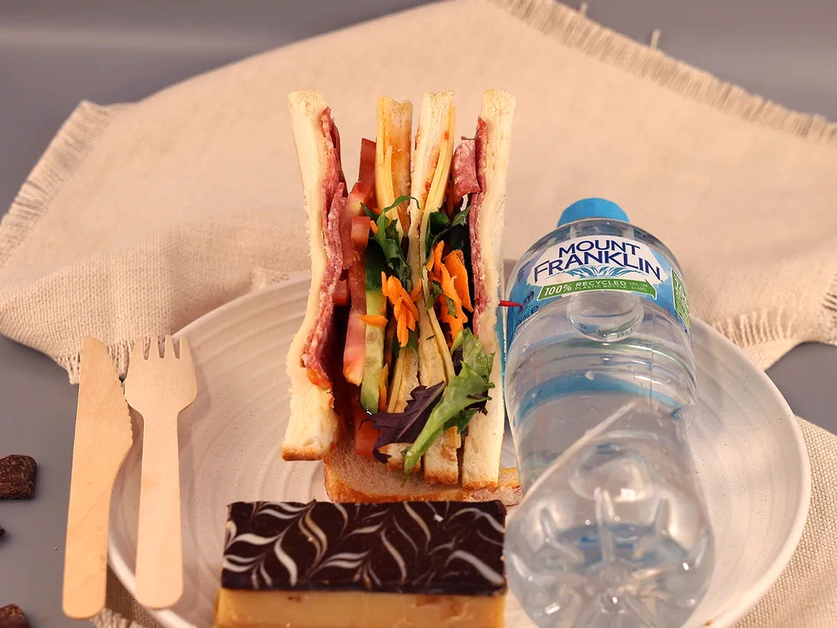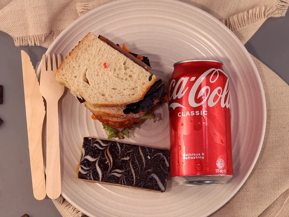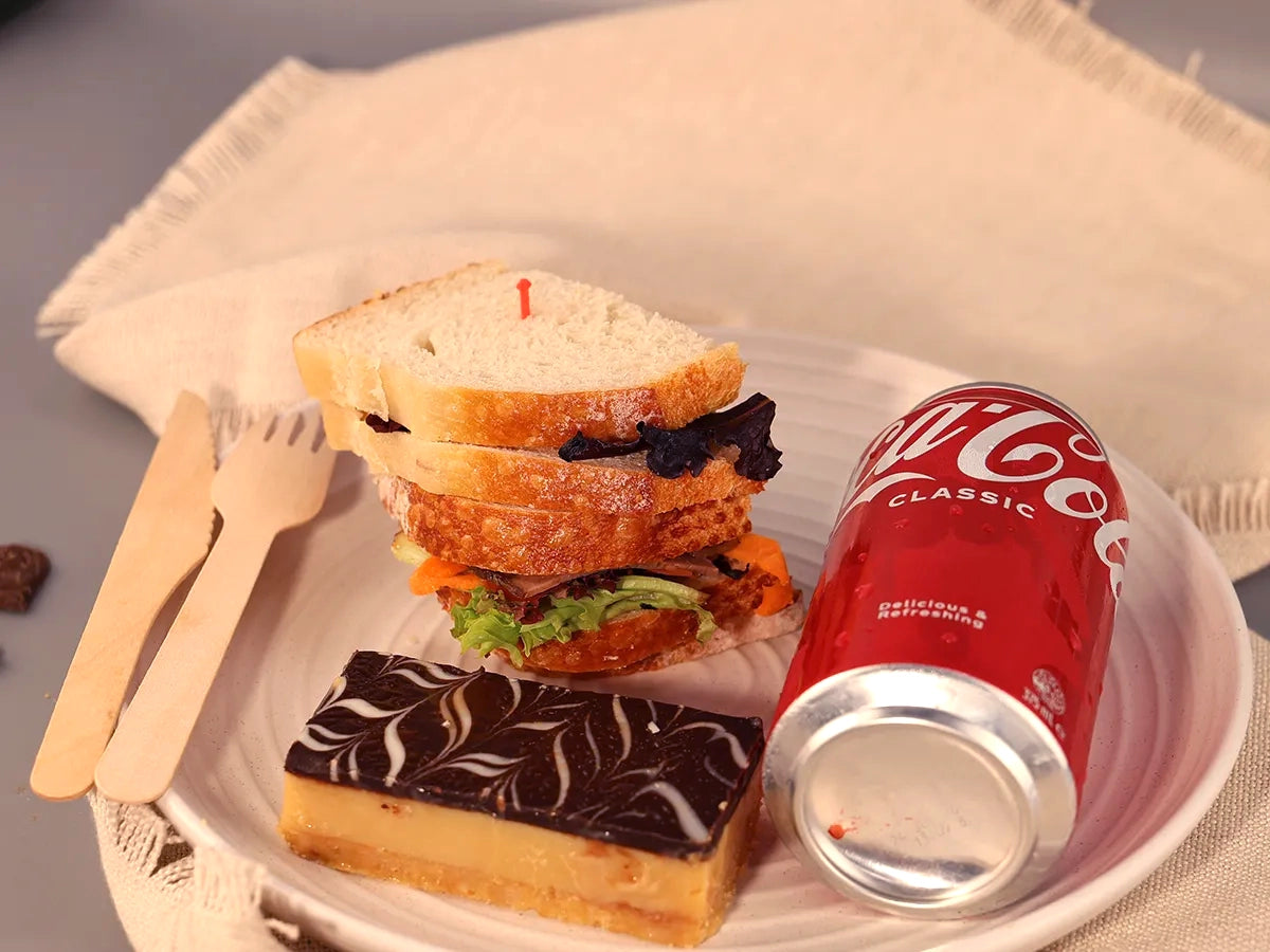 Savour our Deluxe Deal 05, featuring a gourmet sandwich with fresh, savoury fillings, one flavorful slice of your choice, and a refreshing can of Coke or water.