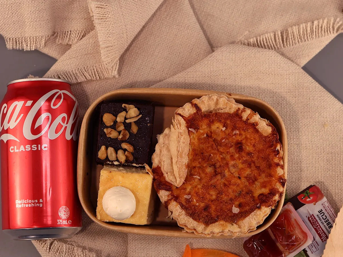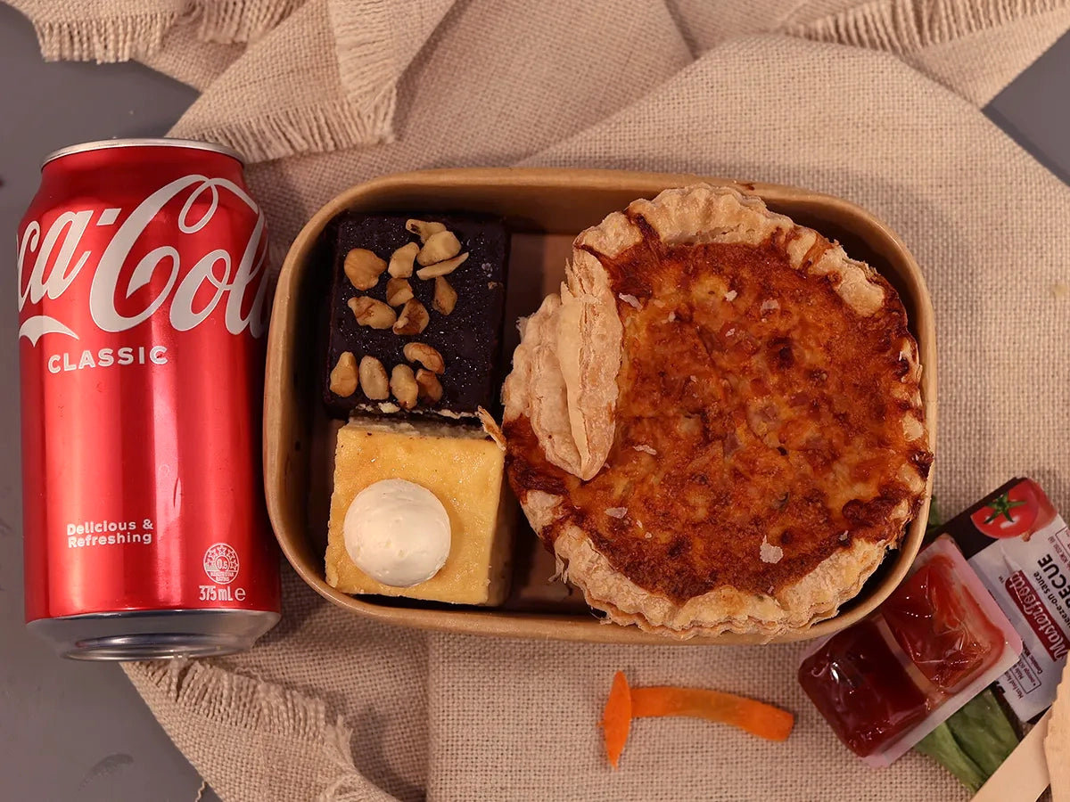 Enjoy our Essential Deal 02. It includes one tasty quiche, two mini slices of your choice, and a can of Coke for a refreshing drink. This bundle is perfect for a corporate breakfast, a community church picnic, or a festive gathering.