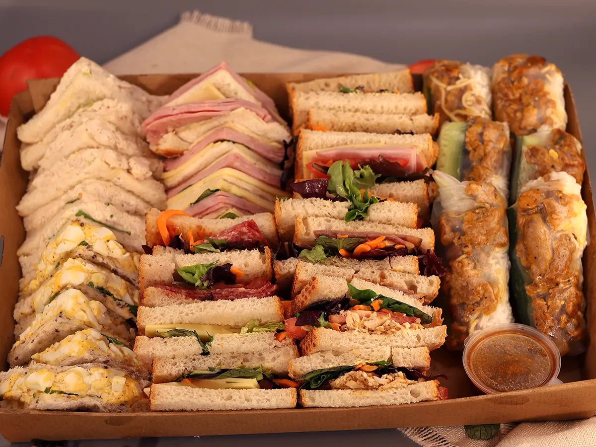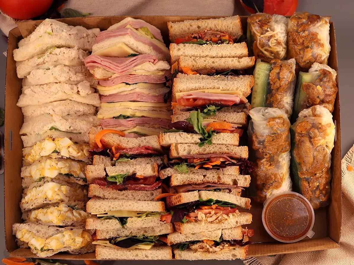 QTY: 28pcs/box, incl: 16 pairs Traditional Triangle Sandwiches, 6 pairs Sourdough Sandwiches, and 6 BBQ Pork/Chicken Rice Paper Rolls.